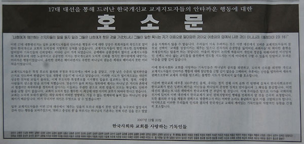 Çѱ¹±³È¸ ´ëºÎÈï100ÁÖ³âÀÎ ¿ÃÇØ, ¿ì¸®´Â Á¤Ä¡ °æÁ¦ »çȸ ¹®È °¢ ¹æ¸é¿¡ °ÉÃļ Çѱ¹ »çȸ·ÎºÎÅÍ Çѱ¹±³È¸°¡ ¹ÞÀº ÀÏ·ÃÀÇ µû°¡¿î ºñ³µéÀ» Çϳª´ÔÀÇ ÁؾöÇÑ Â¡°è·Î ¹Þ¾ÆµéÀÌ¸ç ±× Ã¥ÀÓÀ» Åë°¨ÇÕ´Ï´Ù. À̹ø ´ë¼±ÀÇ °á°ú´Â ¶Ç ´Ù¸¥ ¸Æ¶ô¿¡¼ Çѱ¹±³È¸¿¡ Å« ºÎ´ãÀÌ µÉ °ÍÀÔ´Ï´Ù. ÀÌ¿¡ ¿ì¸®µéÀº ¾ÕÀ¸·Î ´Ù°¡¿Ã ±¹È¸ÀÇ¿ø ¼±°Å¿¡ ÀÖ¾î¼ À̹ø ´ë¼±¿¡¼ Çѱ¹±³°è°¡ º¸ÀÎ ±Ç·ÂÁöÇâÀûÀÎ ÇàŸ¦ ¹Ýº¹ÇÏÁö ¸» °ÍÀ» °£°îÈ÷ ¿äûÇÕ´Ï´Ù. ¶ÇÇÑ ºÒÀÇ¿Í ºÎÁ¤À» Àç¹°°ú ±Ç·ÂÀ¸·Î ¹úÃæÇϰíÀÚ ÇÏ´Â ¾î¶°ÇÑ ³í¸®µµ ¿ë³³ÇÏÁö ¾Ê°í À̸¦ °í¹ßÇϰíÀÚ ÇÕ´Ï´Ù. ¸¶Áö¸·À¸·Î ÀÌ·¯ÇÑ ¿ì¸®µéÀÇ Àνİú °áÀÇ¿¡ Çѱ¹ °³½Å±³ ±³È¸ÀÇ ±ú¾îÀÖ´Â ±âµ¶ÀεéÀÇ ÀÚ¹ßÀûÀÎ µ¿ÂüÀ» °£ÀýÈ÷ È£¼ÒÇÕ´Ï´Ù.